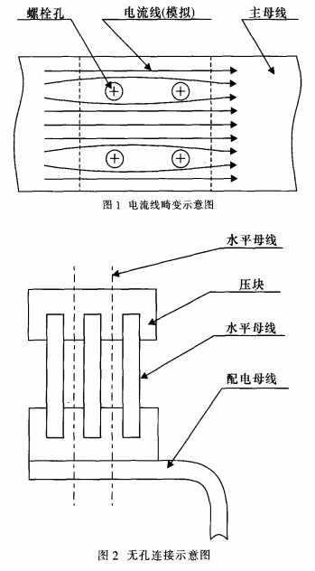 現在,低壓成套開關設備母線槽體系的聯接首要是運用螺栓聯接。螺栓聯接在小電流、母線槽數量不多的情況下具有緊湊、牢靠、便當等特征;而跟著用電設備的增加,開關柜的容量越來越大,用螺栓聯接的缺點也日益顯露出來:由于需求在母線槽上鉆螺栓孔,構成母線槽截面不同,必然引起母線槽電流流線的畸變,如圖1所示。所以要求螺栓用孔盡可能的小以盡量減小對電流的影響,但是在配電房里進行拼柜的過程中不可避免的存在累積公役,開關柜的數量越多累積公役越大,往往構成配電母線槽和主母線槽的螺栓孔產生錯位。為了處理螺栓孔錯位問題,大都情況下是選用沖橢圓形孔或沖大孔。這就存在對立:螺栓孔開大了,嚴重影響母排載流量,螺栓孔開小了,設備不便當。研討新的聯接辦法成了開關柜制造商的重視的焦點,無孔聯接這種新技能逐漸成為規劃人員研討的方針,而且取得必定的成功。現在已有多家廠家研討出辦法各異的的無孔聯接技能。筆者也于2001年初步對無孔聯接技能進行研討,并規劃出另一種與眾不同的無孔聯接辦法,經過產品試制和試驗,證明這種聯接辦法是卓有成效的。