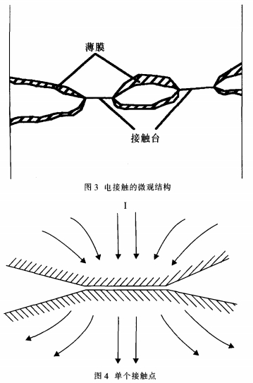 要知道在母線槽聯接處的電阻,除了母線槽自身存在的電阻外,還存在一個觸摸電阻。這是由于:不論母線槽外表處理得怎樣潤滑平坦,在微觀環境下,母線槽外表也是高低不平的,如圖3所示,兩片母線槽之間的搭接實踐上只需母線槽外表上許多小尖峰之間的觸摸,電流流過搭接面的實踐面積減少了,電流線產生嚴峻的縮短現象,產生縮短電阻R,取其中一點分析其結構如圖4所示。另一方面,母線槽從加工結束到裝在開關柜里有必定的時間差,很簡單由于暴露在空氣里而構成一層薄膜(如氧化膜等),使電阻增大,稱為膜電阻R,。所以觸摸電阻實踐上是由這兩部分組成,即