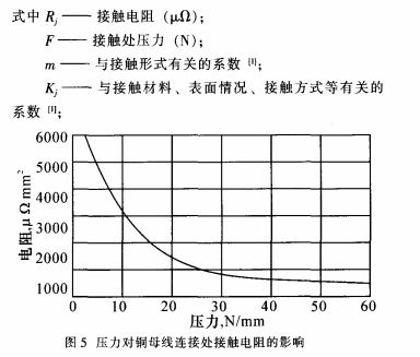 由公式(2)可知,影響母線槽搭接面觸摸電阻的首要要素有外表的條件K、m和所施加的壓力F。當母線槽外表處理和觸摸面積確認了,則Kj、m也確認了,于是觸摸電阻Rj與壓力F成為反比聯絡,壓力F越大,觸摸電阻Rj越小。圖5是壓力對兩片銅導體聯接處觸摸電阻的影響曲線圖。