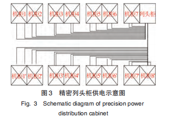 計劃2:假如選用傳統(tǒng)的精細(xì)列頭柜配電計劃,則需為兩列機(jī)柜配置 1個精細(xì)列頭柜,并向每面機(jī)柜提供雙電源供電。如圖3所示。