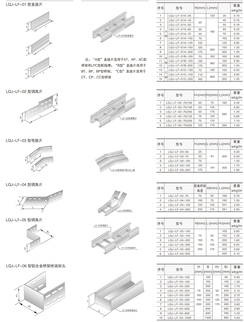 鋁合金電纜橋架在某種結構形式中無其它結構形式中的某-種產品類別,選型可作代用表示。例如:在LQU-CC型槽式鋁合金電纜橋架結構形式中,無鋁合金配線橋架中的LPC-03D, 即表示為LFC-CC-03D。